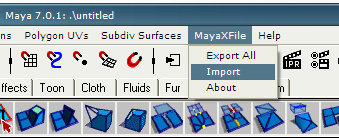 Using the Maya 7 API I created an import/export tool that supports the Direct X .x model file format. It allows for multiple meshes, triangulates if necessary, along with preserving normals and UVs. A few additional features like adding a default blinn to a model was added as well.